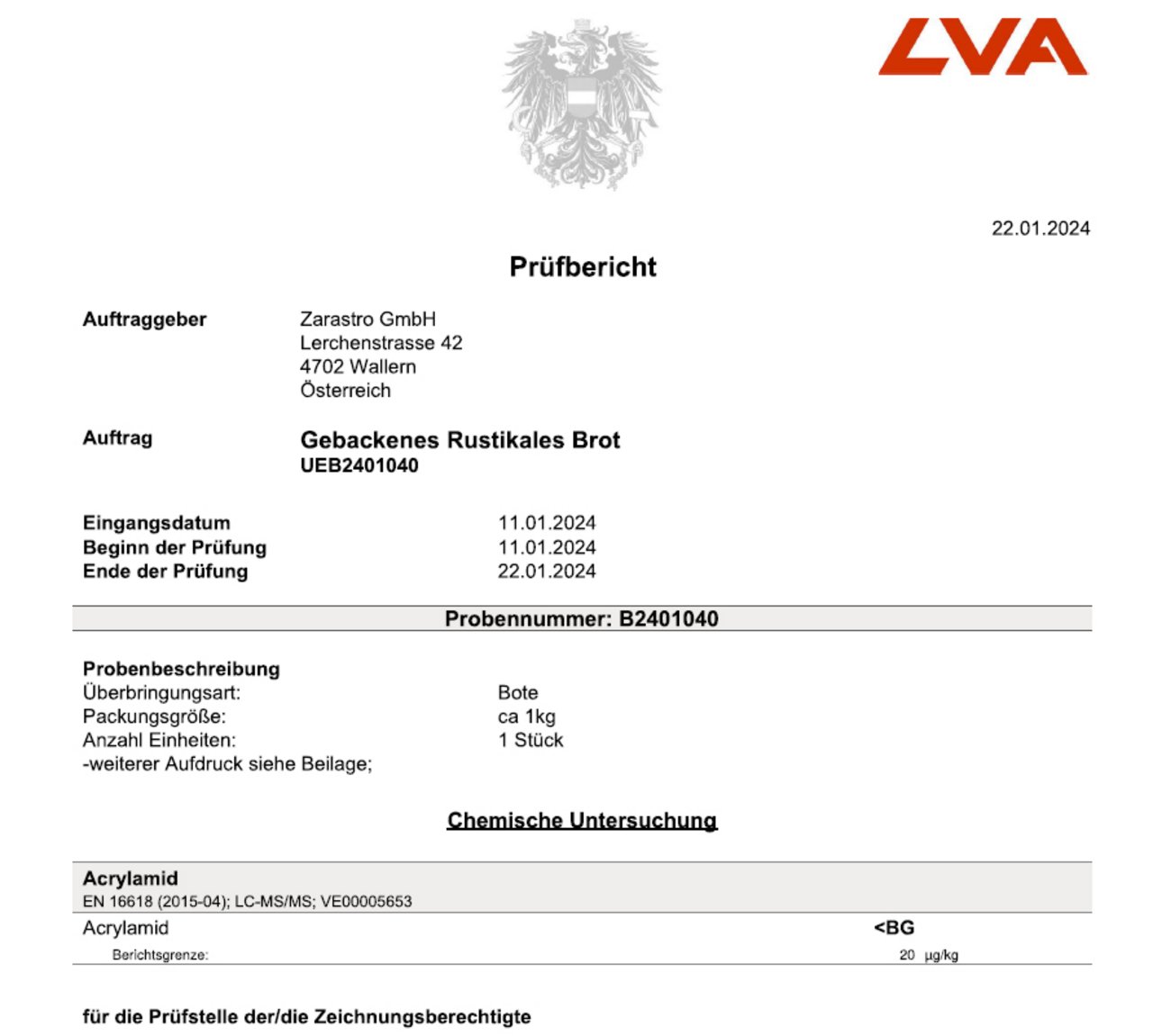 Wir haben aus unserer RUSTIKALEN BIO BACKMISCHUNG Brot gebacken bei extra hoher Temepratur: Eine Stunde lang bei 250 Grad. Und das haben wir dann ins Labor geschickt, um es auf Acrylamid zu testen.